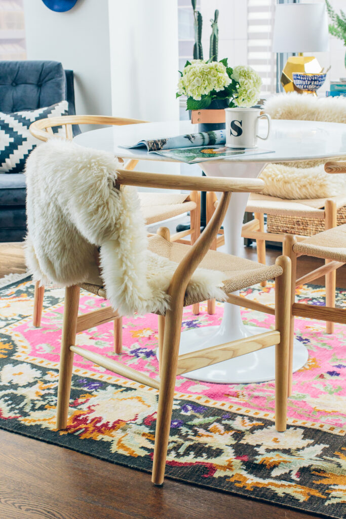 The bold color palette balanced beautifully with our marble-topped tulip table—sleek and modern without feeling cold. Paired with natural wishbone chairs draped with faux-sheepskins, the whole setting felt casual and comfortable while still polished enough to host a little dinner party.