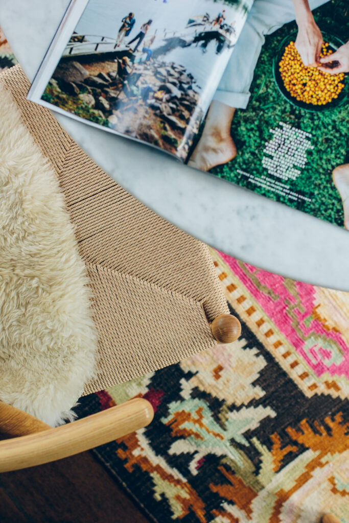 A pink rug might feel like a bold move, but unexpected color in this space is what pulls it all together. It gives the room a collected vibe.